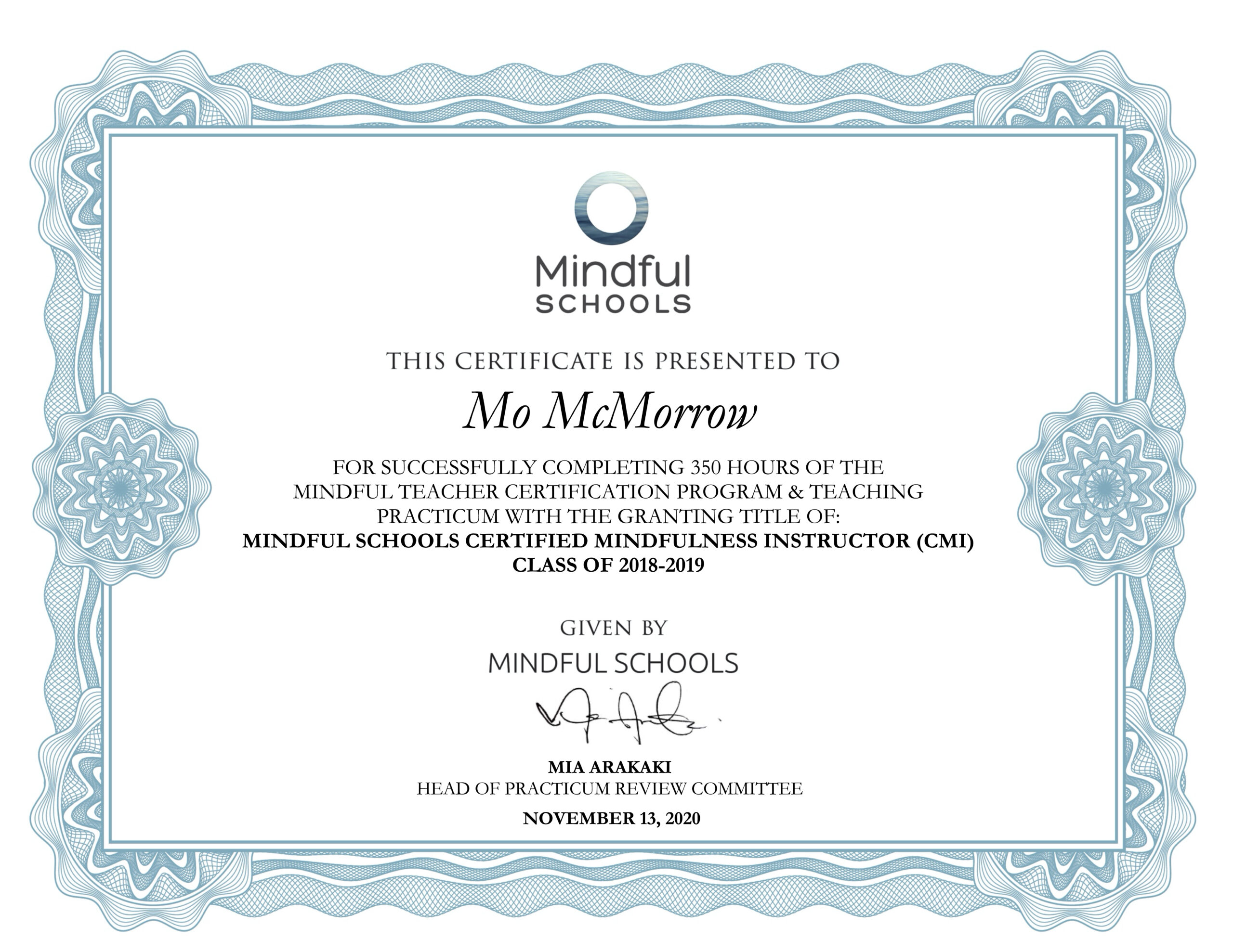 To best address the emotional needs of her students she became a certified mindfulness instructor through Mindful Schools. She found the practice of mindfulness in the classroom greatly enhanced the classroom culture. She credits her meditation practice for the ability to deal with the extreme pressure of being the only teacher in a 2 teacher classroom, having to de-escalate extreme behaviours daily in a school continually faced with closure. Mo describes her years teaching there as “the most profound years of my life.”